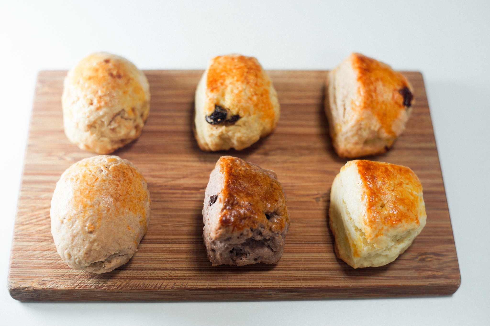 (左上依序) 黑糖麻糬司康 / 蘭姆葡萄司康 / 蔓越莓司康